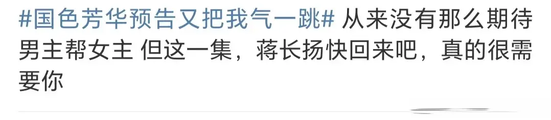 这部剧看到现在,女主一直在自救,一直在努力的活着,一直想要掌控自己的命运,但现在的剧情却让渴望女主成长的网友感叹:第一次希望蒋长扬赶快回来!